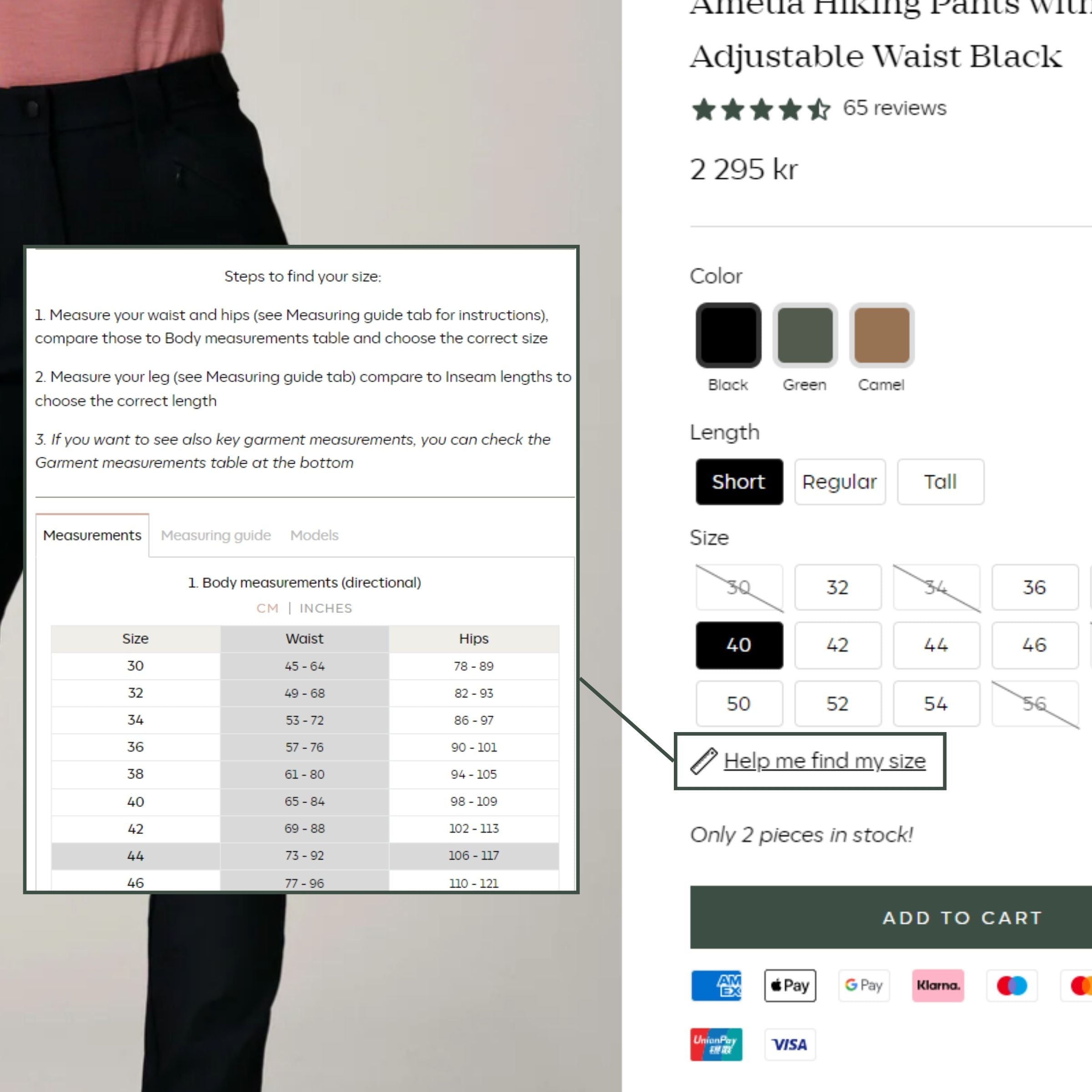 Each product page has a link to a product specific size guide. Click the 'Help me find my size' link and find product-specific measurement tables in centimeters and inches as well as images of models, with their measurements, wearing the product.